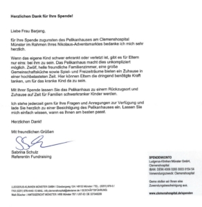 Auch wenn unsere Gedanken jetzt beim Osterfest sind und die Kinder sich auf den Osterhasen freuen… Vielleicht erinnern wir uns noch den gelungenen Nikolaus- und Adventsmarkt, der im Dezember in der St. Stephanuskirche stattfand. Dabei wurde mit dem Verkauf von Engelchen, Plätzchen, Socken und Marmeladen ein Erlös von 720,00 € erwirtschaftet. Diese Geld haben wir dem Pelikanhaus am Franziskushospital zur Verfügung gestellt. Damit sollen die Eltern sich und ihren Kindern eine besondere Freude machen können, um wieder Kraft zu tanken für sich und ihr krankes Kind.