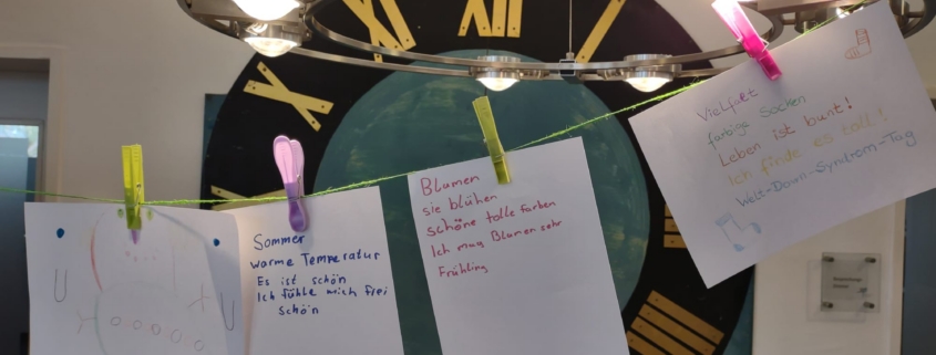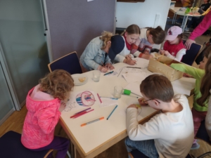 Für Kinder gab es eine besondere Aktion: Sie konnten unter Anleitung ein eigenes „Elfchen“ zu einem selbst ausgesuchten Thema verfassen. Elfchen sind kleine Gedichte, die aus elf Wörtern verteilt auf fünf Zeilen bestehen. In der Regel lernen Kinder diese Gedichtform bereits in der Grundschule, so dass sich im Gegensatz zu den Erwachsenen fast alle gut damit auskannten – demnach war der Andrang groß! Eine Auswahl der Ergebnisse finden Sie aktuell als Aushang in den Fenstern der Bücherei.