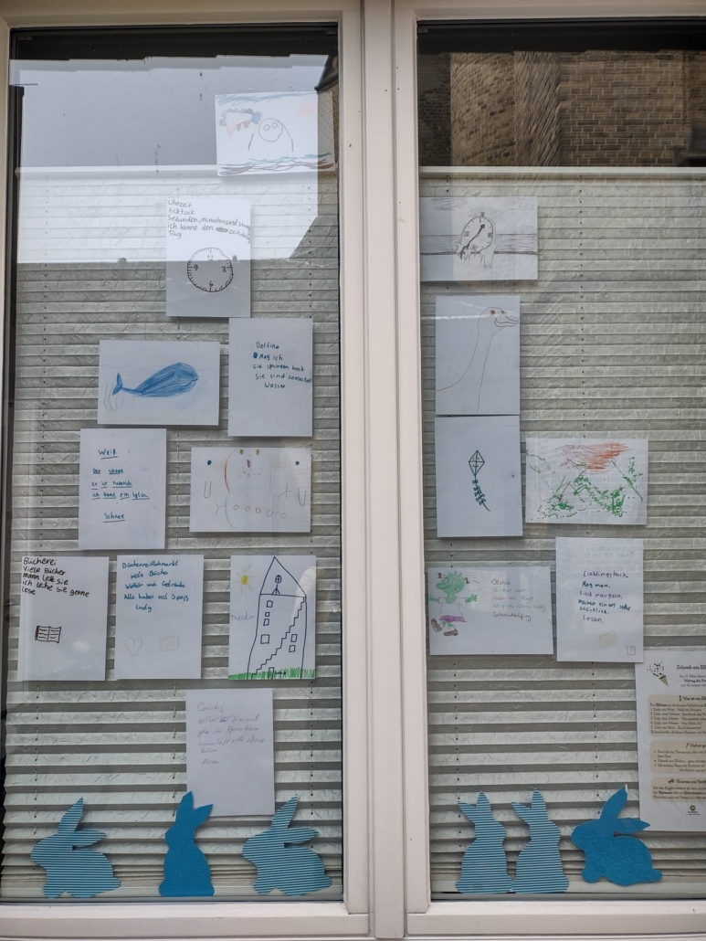 Für Kinder gab es eine besondere Aktion: Sie konnten unter Anleitung ein eigenes „Elfchen“ zu einem selbst ausgesuchten Thema verfassen. Elfchen sind kleine Gedichte, die aus elf Wörtern verteilt auf fünf Zeilen bestehen. In der Regel lernen Kinder diese Gedichtform bereits in der Grundschule, so dass sich im Gegensatz zu den Erwachsenen fast alle gut damit auskannten – demnach war der Andrang groß! Eine Auswahl der Ergebnisse finden Sie aktuell als Aushang in den Fenstern der Bücherei.