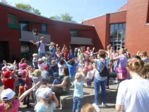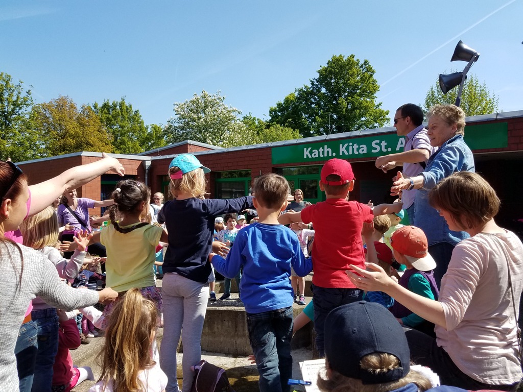 Danach zogen alle in die Kirche. Hier gab es als Highlight die Aufführung der Vorschulkinder beider Einrichtungen der Lieder, die sie am Freitag in der Innenstadt auf dem Katholikentag präsentieren. Die Lieder wurden mit viel Bewegung vorgeführt und anschließend bekamen die Kinder entsprechend guten Beifall. Der Pastoralreferent Hendrik Werbick hielt einen kurzen Impuls über das Thema Frieden. Die Kinder konnten mit vielen Antworten beitragen. Das „Vater unser“ wurde mit Bewegung gesprochen. Nach weiteren gemeinsamen Liedern gab es einen Segen.